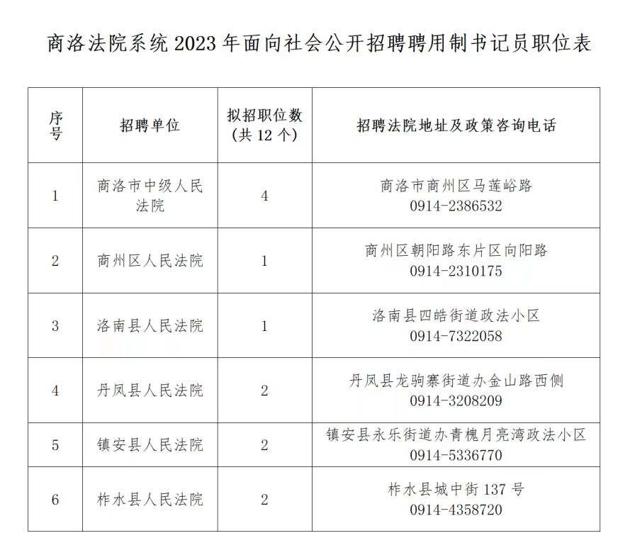 全市法院共招聘聘用制書(shū)記員12名,各法院招聘職位、地址及政策咨詢電話詳見(jiàn)《商洛法院系統(tǒng)2023年面向社會(huì)公開(kāi)招聘聘用制書(shū)記員職位表》(附件)。
